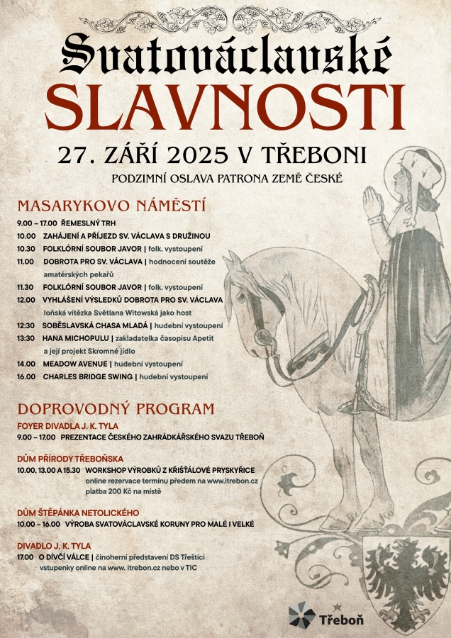 Podzimní slavnosti sv. Václava 27. září 2025 v Třeboni nabídnou po celý den řemeslný trh, prezentaci tradičních řemesel, a prezentaci oceněných Regionálních potravin Jihočeského kraje. Nebude chybět ochutnávka pivovaru Regent, moravského vína a další. Vystoupí různé kapely.